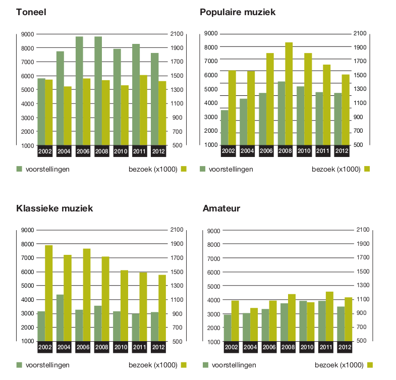 Dat allemaal om te verhullen dat het echte slechte nieuws is dat de dramatische terugloop van het theater- en concertrbezoek in 2012 nog erger is dan iedereen al verwachtte. Dat ‘usual suspects‘ als toneel en klassieke muziek het slecht doen, en dat de musical aan een vrije val bezig was, wisten we al. Maar dat het bezoek aan populaire muziek zo spectaculair terugloopt als uit de cijfers blijkt, is best wel een schokkende verrassing. Ook popconcerten zijn dus niet meer in trek.