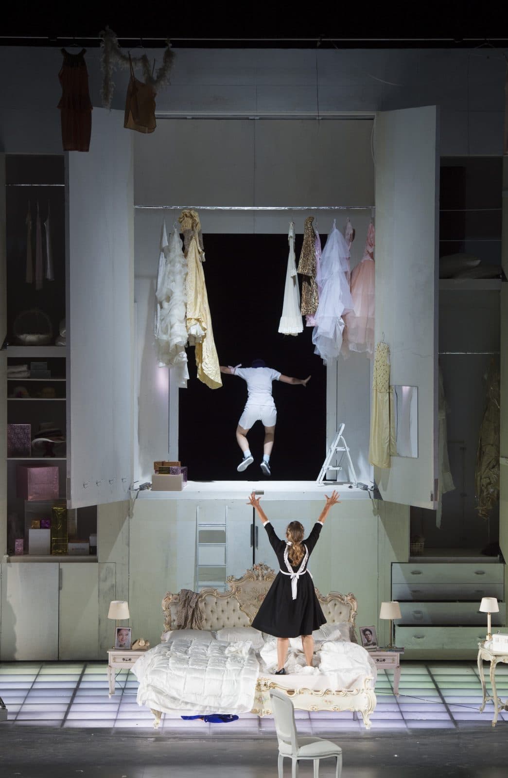 De aankleding ademt de sfeer van de jaren vijftig. Geestige anachronismen zijn de in Mozartkostuum en dito pruik gestoken kamerdienaars, die perfect op de maat van de muziek de rekwisieten verplaatsen. Susanna opent en sluit met een afstandsbediening de vele kastdeuren waarachter nu eens de een, dan de ander zich verstopt. En als Bartolo (de bas Umberto Chiummo) en Marcellina (de mezzosopraan Katharine Goeldner) elkaar gelukzalig in de armen vallen, maken zij enthousiast selfies met hun zojuist hervonden zoon en diens verloofde.
