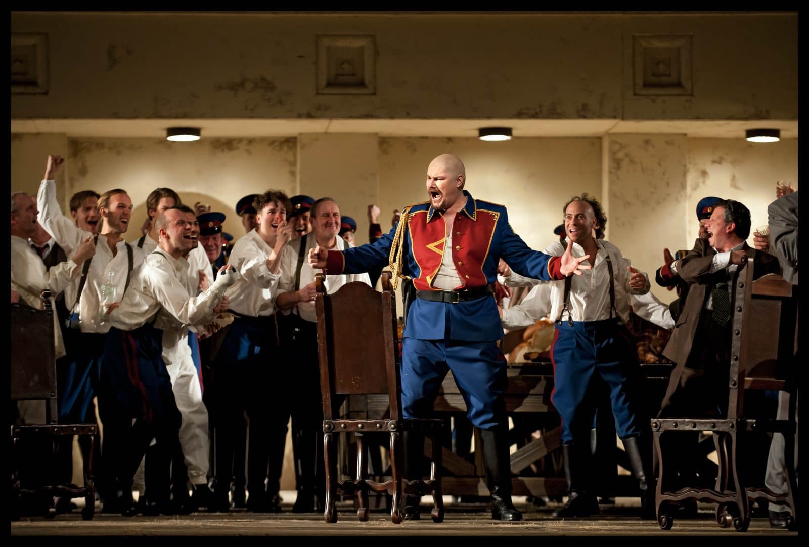 Nou worden de zangers bepaald niet geholpen door de personenregie van Tcherniakov. De clichématige, weids uitgestrekte armen en vertwijfelde blikken gaan op den duur zelfs op de lachspieren werken. Dat de regisseur het Koor van De Nationale Opera op cruciale momenten vanaf de balkons laat zingen, is ook geen slimme zet. In de opzwepende Polovetser Dansen lopen orkest en zangers soms behoorlijk uit de pas. Het koor zingt uitstekend, maar ontbeert de sonoor zoemende klank die zo kenmerkend is voor Russische muziek.