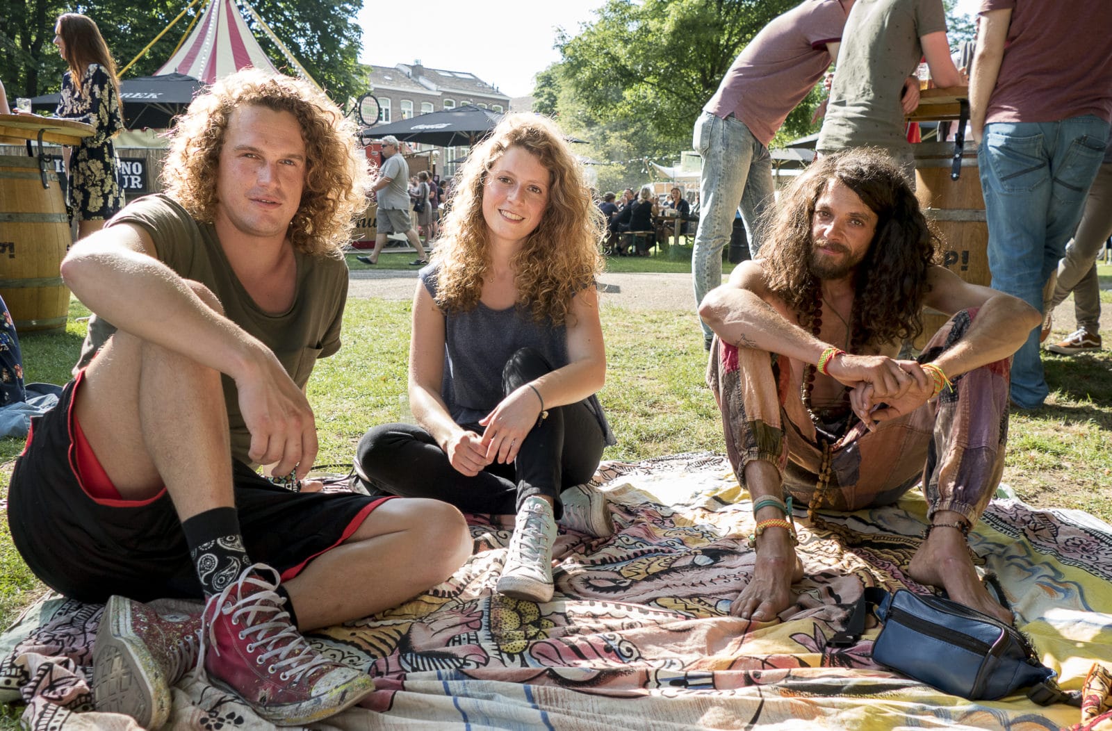 Op het grasveld voor het grote podium achterin wordt het een beetje Woodstock. Bezoekers liggen op meegebrachte kleedjes te genieten van eten, muziek en kleine theateracts. Of ze dansen alsof ze onder stroom staan. Het lage strijklicht blijft hangen in de grote bossen haar van Erwin Duijsings, vriendin Giulia Baiocchi uit Lucca (It) en Zies (‘dat moet voldoende zijn’), met z’n drieën op een kleedje.