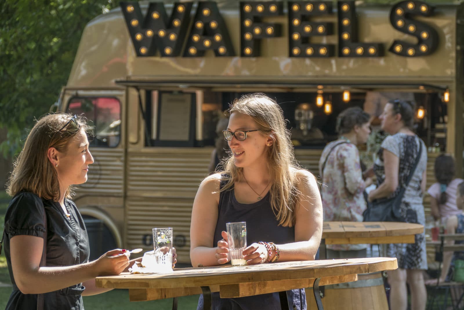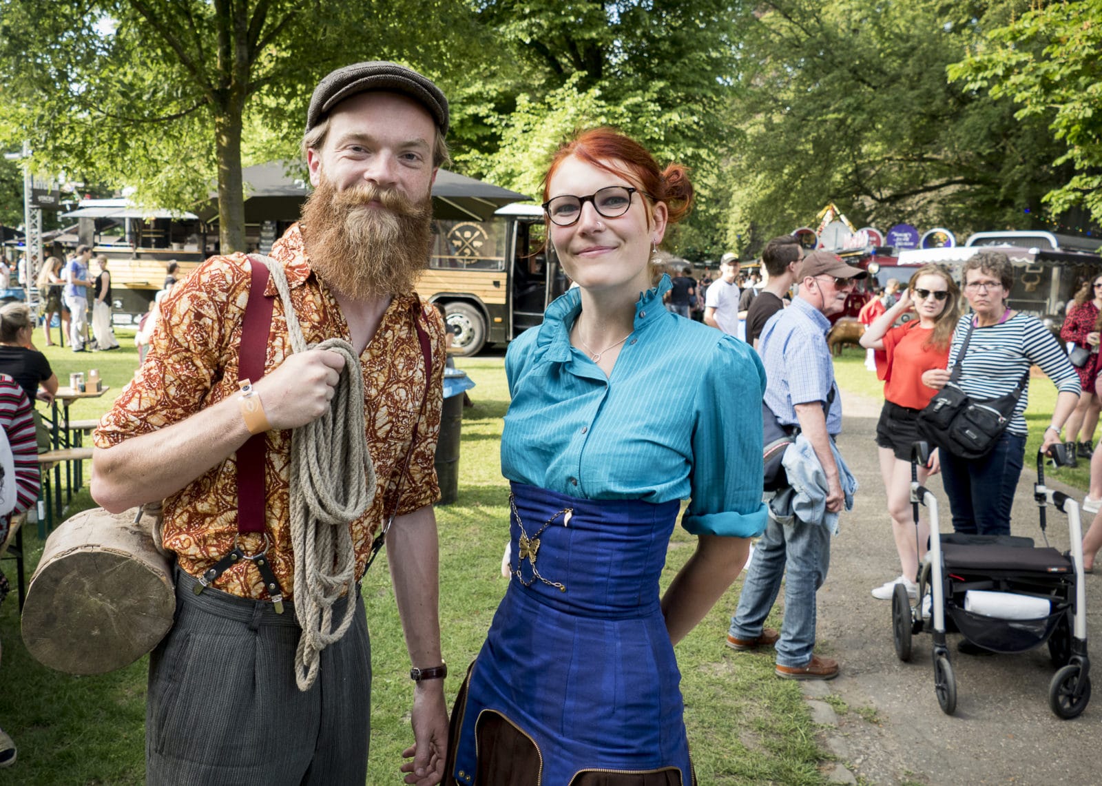 Waarom zijn jullie hier? Erwin: ‘Nou ja, het lekkere park, lekker eten, drinken, sfeer… In de avond komt er een dj, daar hou ik van.’ Erwin werkt aan een boek over de filosofie van het dagelijkse leven, een totaalvisie, zegt hij. ‘Daar past dit wel in.’ Zies speelt verveeld, een peuk wiet in de mondhoek. ‘Ik vind het wel best, veel eten.’ Of we wel de foto kunnen sturen.