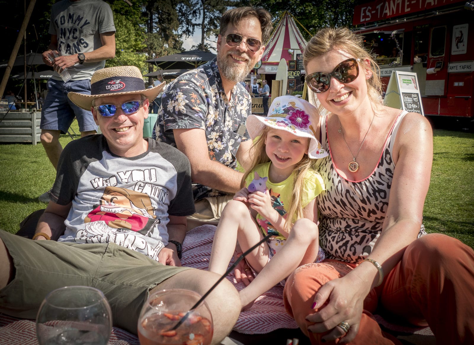 Ronald chilt met schoonzus Charlotte, haar man Jim en dochtertje Isabelle op een stapel kussens in de zon. Grote bolle cocktailglazen voor hun neus, ze zijn zichtbaar in hun nopjes. Ronald woont al twintig jaar in Maastricht en bezoekt TREK dit jaar voor de derde keer. ‘Voor het eten en het relaxte genieten. Ik hou van eten en de mix van dingetjes eromheen.’ Wat vindt hij van het theater? Ronald: ‘Zolang het niet ten koste gaat van het eten vind ik het best. Het valt op dat er elk jaar meer is voor kinderen, dat is leuk. Je ziet veel familie met kinderen aan het einde van de middag en begin van de avond.’