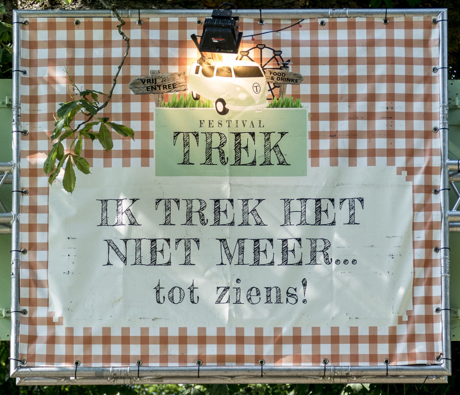 Aan de vijver vormen vier reusachtige letters het woord TREK. De naam is beslist een vondst. ‘Trek’ heet in de taalwetenschap een ‘productief woord’. Het leent zich gemakkelijk voor ontelbare grappen en woordspelingen. We hebben ze die vrijdag allemaal langs horen komen: van ‘ik heb grote trek’, ‘ik trek het niet meer’ en ‘ik vind je vet aantrekkelijk’ tot ‘ik voel me afgetrokken, ik ga naar huis’.