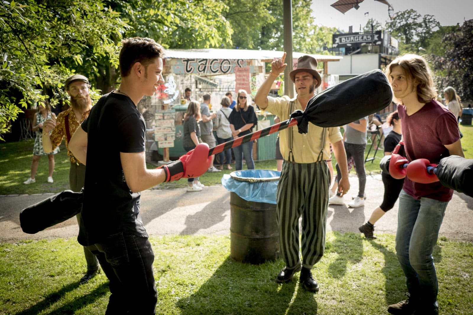Je moet wel een ernstige misantroop zijn om het die vrijdag niet naar je zin te hebben in Stadspark Maastricht. De zon schijnt. Het is subtropisch warm met een licht lentebriesje. De locatie, naast een door stadswallen en torentjes omarmde vijver, is perfect. Onder de oude eiken staat een veertigtal foodtrucks en bars met pruttelende keukentjes op je te wachten. Oh ja, niet onbelangrijk: de toegang tot Festival TREK is gratis. De eerste kennismaking met TREK geldt niet een barista of vleesmeester maar een waanzinnig zegenende pastoor voor zijn eigen kerkje. Die omzeilend lopen we in de armen van de man die is ingehuurd is voor alle theatrale uitingen op het terrein: Adam Boutiche, de ‘eindbaas’ van Duece, Events en Entertainment.