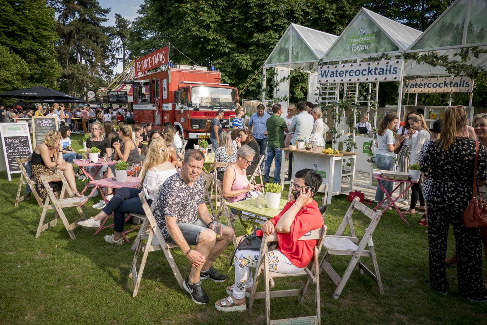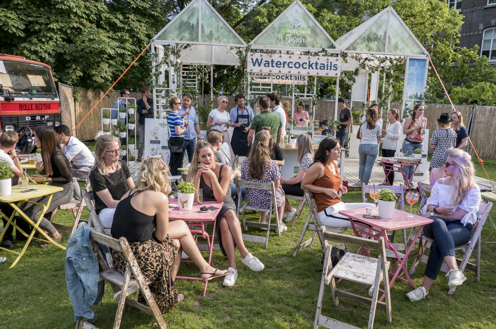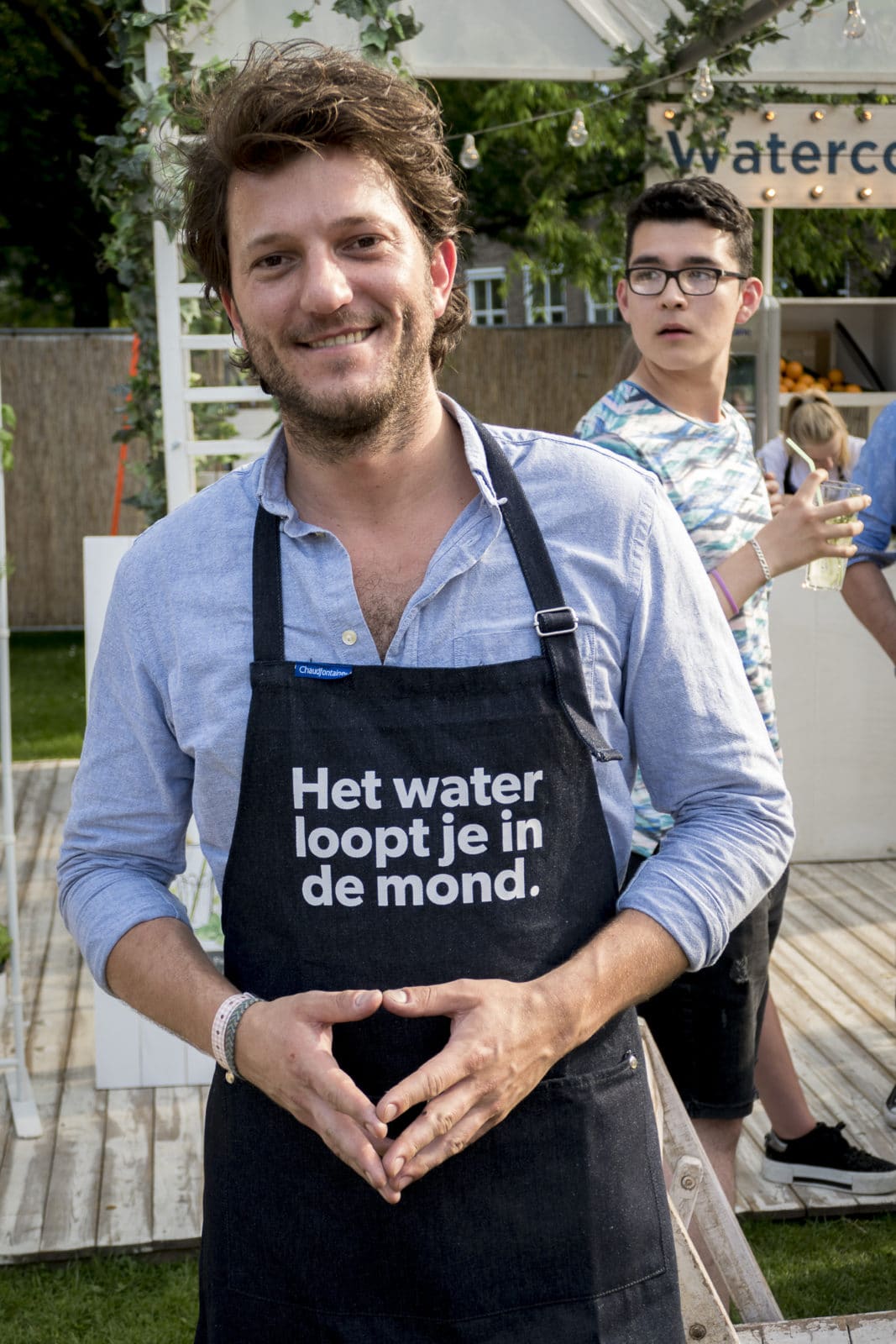 Voor het eerst ruiken we de commercie. Bij de Watercocktailbar, een frisse en sprankelende inrichting, lopen we tegen Freek van Noortwijk op, een mooie jongen met de tekst ‘Het water loopt je in de mond’ op zijn schort. Freek (29) is chef-kok en mede-eigenaar van vier restaurants in Amsterdam, jurylid bij Masterchef en als verloofde van Katja Schuurman ook nog eens een Bekende Nederlander. ‘Ik ben de hoofdambassadeur van Chaudfontaine’, zegt Freek. ‘Dat hoort bij Coca-Cola, van de Vuurtorenbar.’ Just, de onontkoombare BurgeRmeester van TREK (de R komt van ‘burger’) legt uit. ‘Sponsors zijn nodig. We willen dat ze zich heel terloops en onopvallend presenteren. Coca-cola heeft enkel een nostalgisch wandje bij de Vuurtorenbar.’