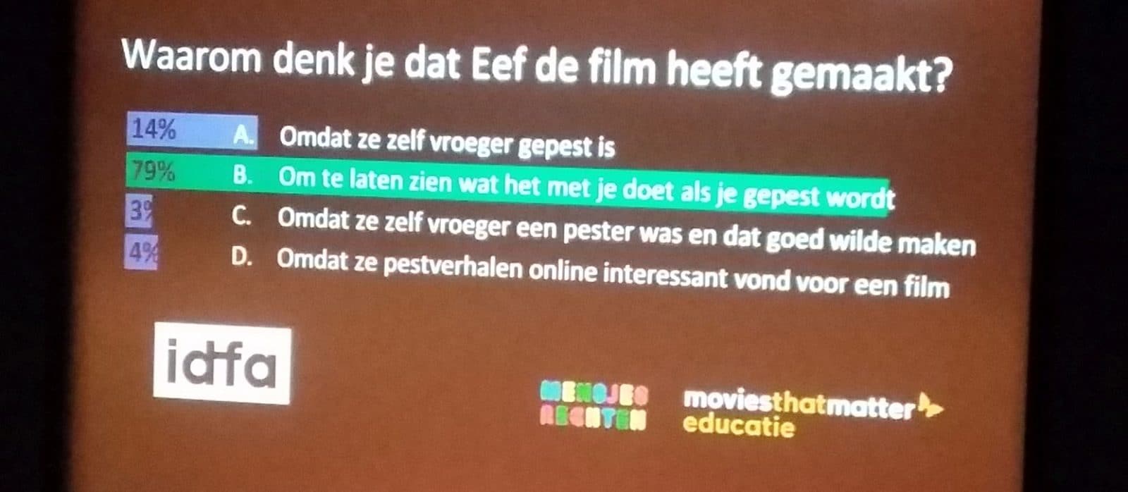 Een mooi extraatje is natuurlijk dat bij de nabespreking de kinderen uit de film op het podium verschijnen. De zaal mag vragen stellen. Echter kan het niet worden. Intussen zijn er stemkastjes uitgedeeld waarmee de jonge kijkers hun mening geven over vragen als ‘Wat vind je erger, online pesten of pesten op het schoolplein’ of ‘Waarom denk je dat Eef de film heeft gemaakt’. De scores verschijnen live op het doek.