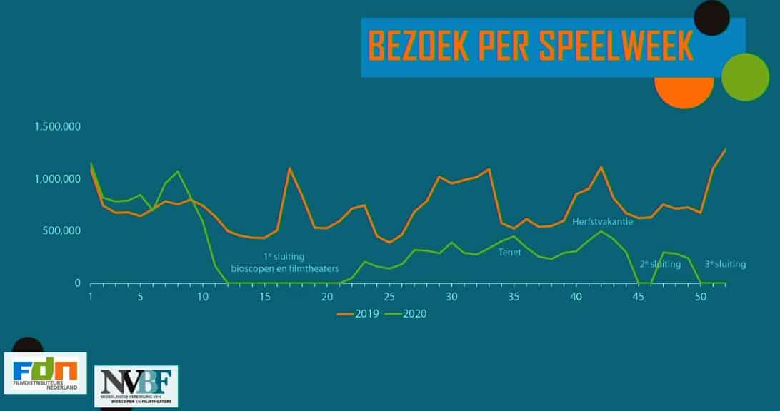 Het contrast kon nauwelijks groter zijn. Na het topjaar 2019 dook de bioscoopbranche in 2020 diep in het coronadal. Met in totaal 15 weken sluiting en strenge restricties zodra de zalen weer open mochten, is het bezoek dramatisch gedaald. Van 38 miljoen naar 16,8 miljoen bezoeken, een afname van 56%.
