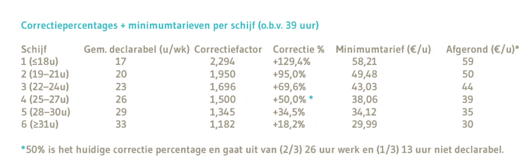 La loi sur le travail indépendant a peut-être été mise de côté par le nouveau gouvernement, mais cela ne signifie pas qu'il est encore question de taux minimaux pour les travailleurs indépendants. Un tel montant minimum (d'ici 2026, il sera de 38 euros par heure) fixe la limite en dessous de laquelle le travailleur indépendant devrait probablement être employé. Mais ce montant n'est pas équitable pour tous les types de travailleurs indépendants. Le fait de pouvoir facturer en moyenne 18 heures ou 28 heures par semaine dans le secteur où l'on travaille n'est pas du tout le même.