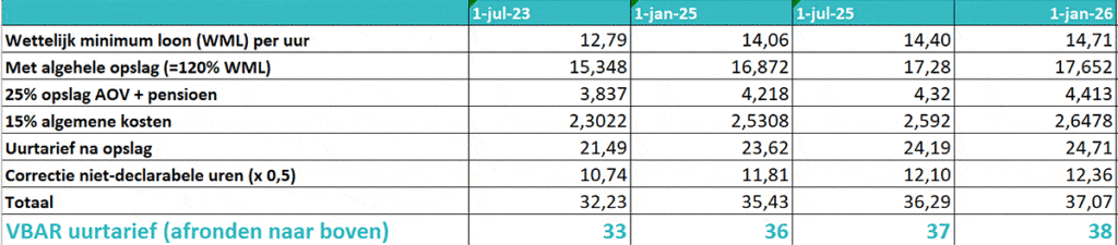 Ainsi, par exemple, si vous travaillez dans un secteur où une moyenne de 23 heures par semaine est facturable (comme le journalisme, par exemple), la limite inférieure devrait être d'environ 43 euros. Dans les secteurs créatifs, vous pouvez souvent travailler encore moins d'heures. Consultez le barème des heures facturables du KNAB sur cette page : https://www.reclamebeeld.nl/zzp-sectorale-rechtsvermoeden-van-minimumtarief-naar-maatwerk/